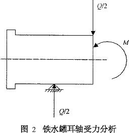 36只鐵水罐耳軸原直徑為φ310 mm,磨損后其直徑分布為φ260 mm ~φ 280 mm不等,鐵水罐中心線偏離原中心線10~20mm。從而導致鐵水罐不能安全使用。而且,耳軸表面凹凸不平也加速對鐵水罐吊鉤襯瓦的磨損。因此必須對耳軸的強度進行校核,并采取相應表面修復措施修復鐵水罐耳軸。